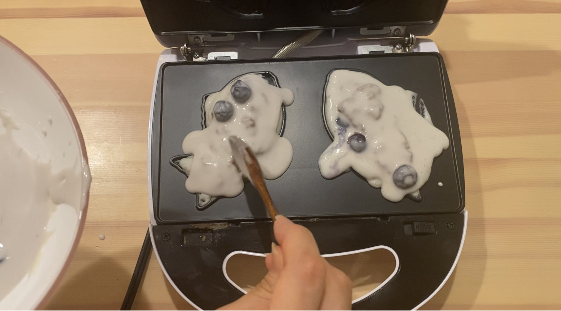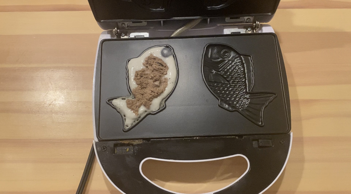 ③よく温めたたい焼き器に油を薄く塗り、生地を1/3底が埋まるくらい流し込む。