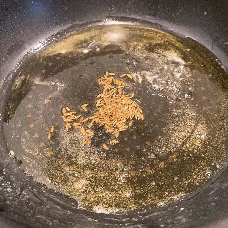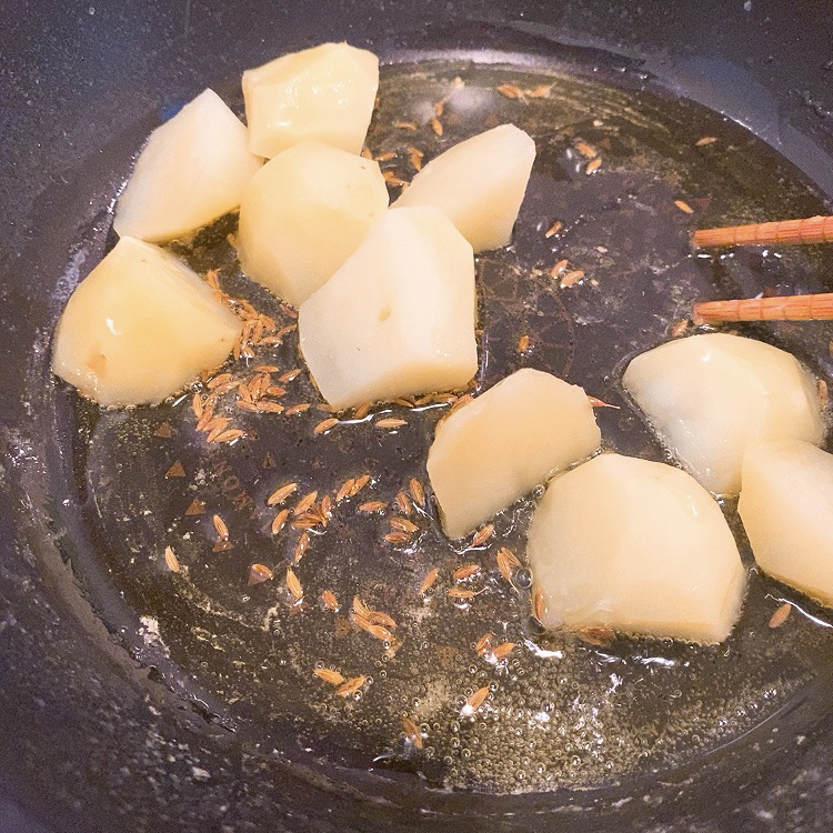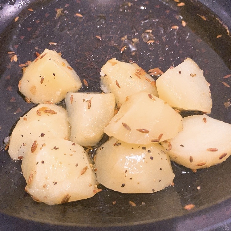 ③じゃがいもを一旦取り出し、同じフライパンにオリーブオイルとクミンシードを加え弱火にかける。