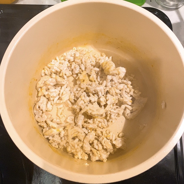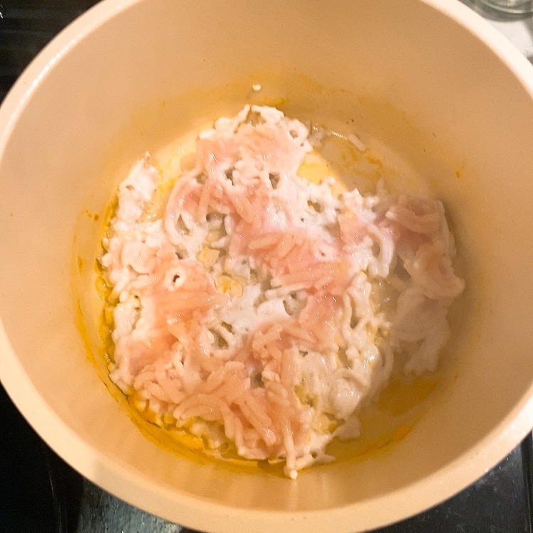 ④同じ鍋に鶏胸ひき肉を入れ弱火で炒める。