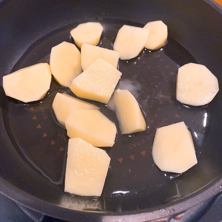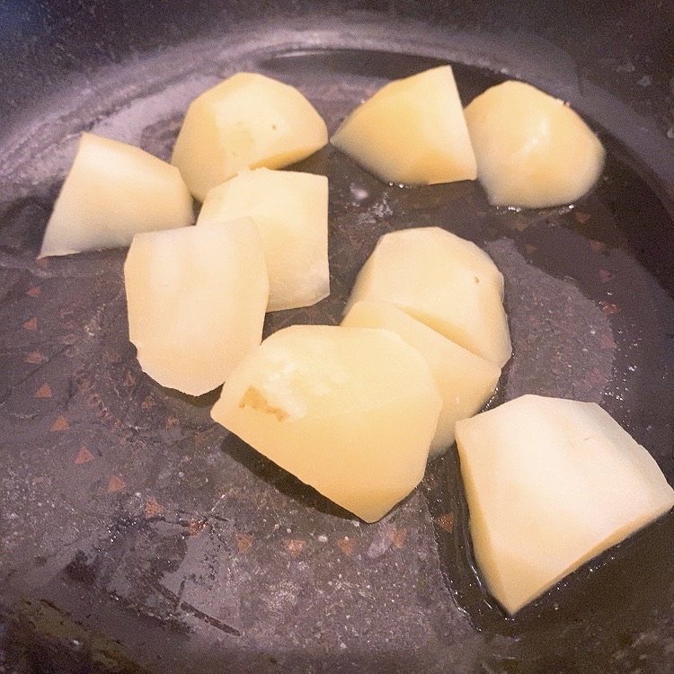 ④香りが立ってきたらじゃがいもを戻し塩、ブラックペッパーを加え絡める。