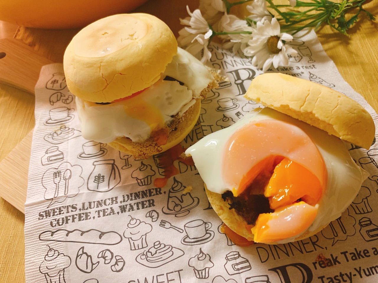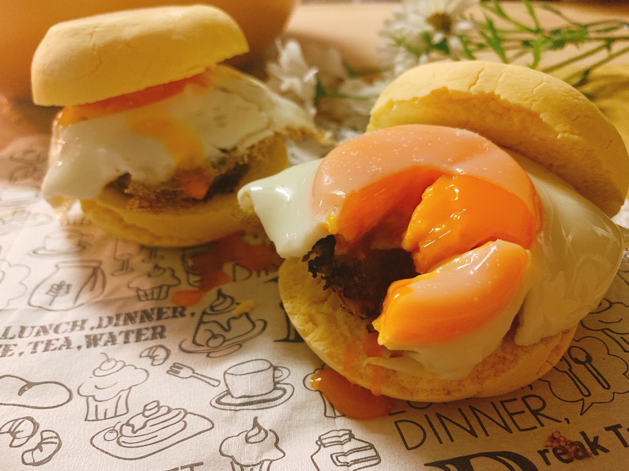 バンズにハンバーグ、目玉焼きの順に乗せサンドする。