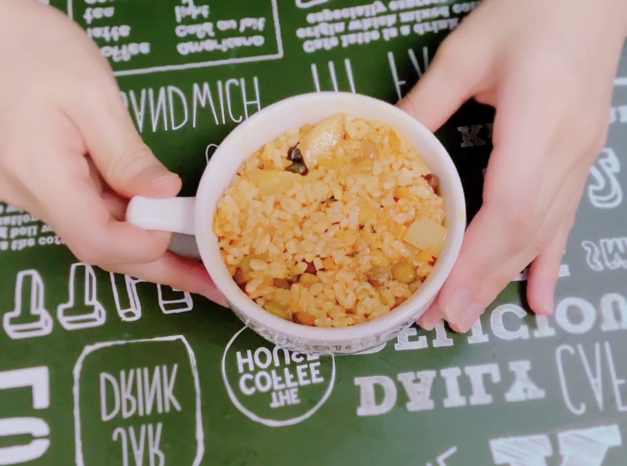 ②一旦火を止め玄米を加え、再び強火にかけて、さっと混ぜ合わせる。