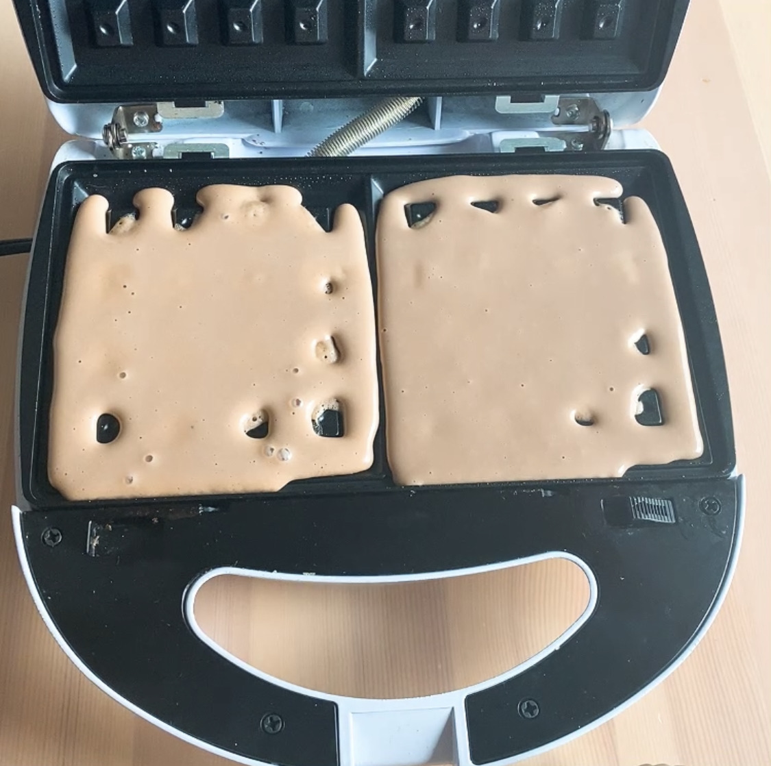 ⑤温めたワッフルメーカーに、キッチンペーパーなどで油を薄く塗り、④を流し込む。