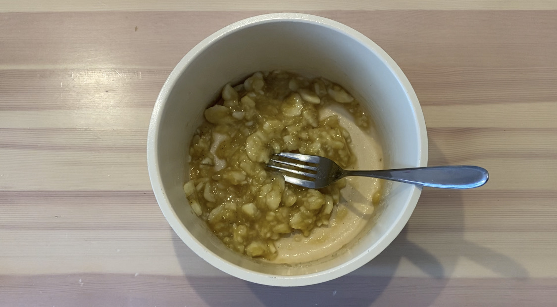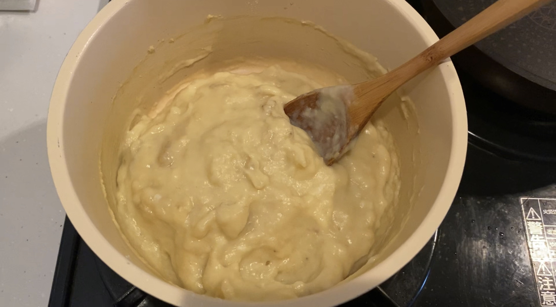ポロポロになってきたらスプーンの裏を使って練り混ぜひとまとめにする。