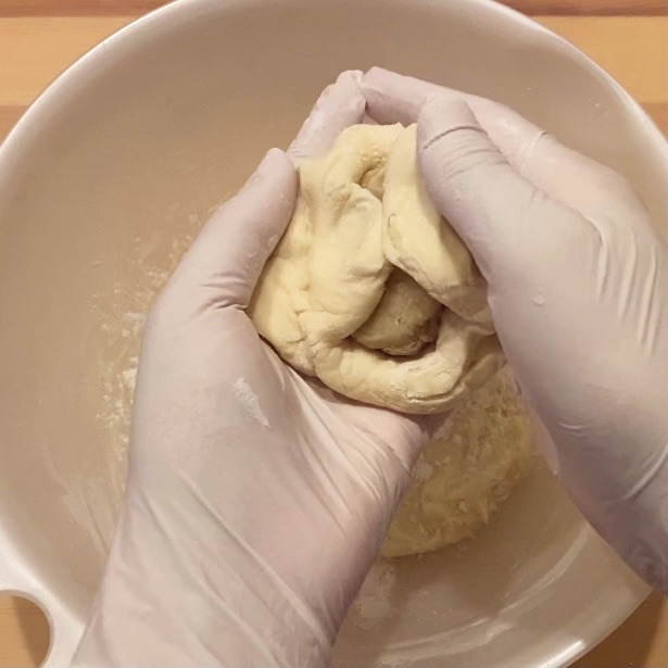 ⑤手に粉を塗し、生地を4つに分けそれぞれ丸める。