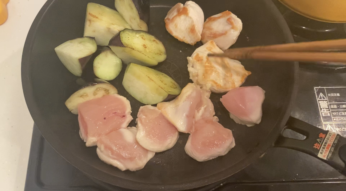 プツプツ細かい泡が立ってきたら中火にし鶏肉を並べる。