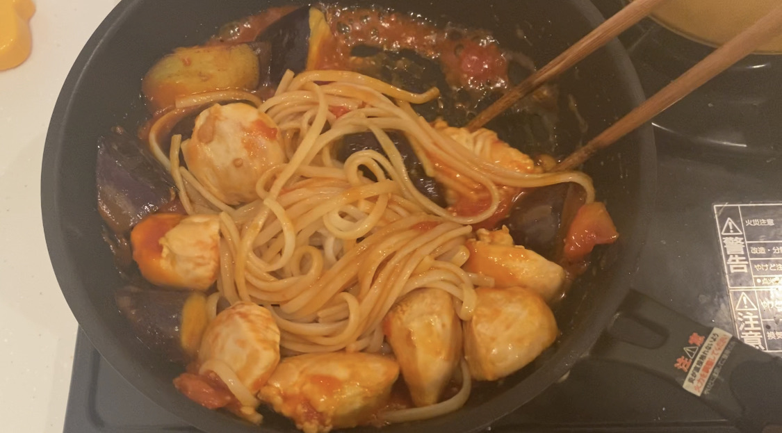 ⑦グツグツしてきたら⑤を戻し、全体に絡める。